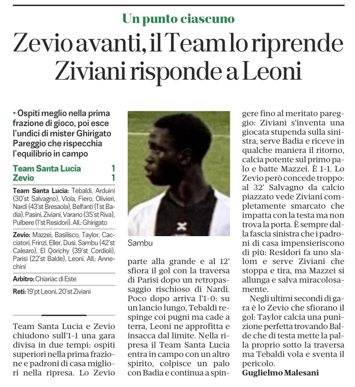 PAREGGIO DELLA PRIMA SQUADRA CHE RIMONTA LO ZEVIO CON IL SOLITO ZIVIANI